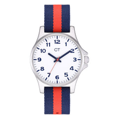 Diese schöne Kinderuhr der Marke Cool Time lässt Kinder-Herzen höher schlagen. Neben dem mit viel Liebe zum Detail entworfenen Streifen-Design wurde bei der Entwicklung auch auf die Qualität besonders viel Wert gelegt. So ist die Kinderuhr mit Textilband schadstoffgeprüft, widerstandsfähig und sehr komfortabel zu tragen. Dank klarer Zahlen und präzisen Minuteneinteilungen wird das Erlernen der Uhrzeit zum Kinderspiel. Ein zuverlässiges Quarzwerk und kratzunempfindliches Mineralglas runden die Kinderuhr optimal ab. Verpackt im coolen Mäppchen ist die Uhr ein ideales Geschenk und sorgt auch in der Schule für "Cool Time".